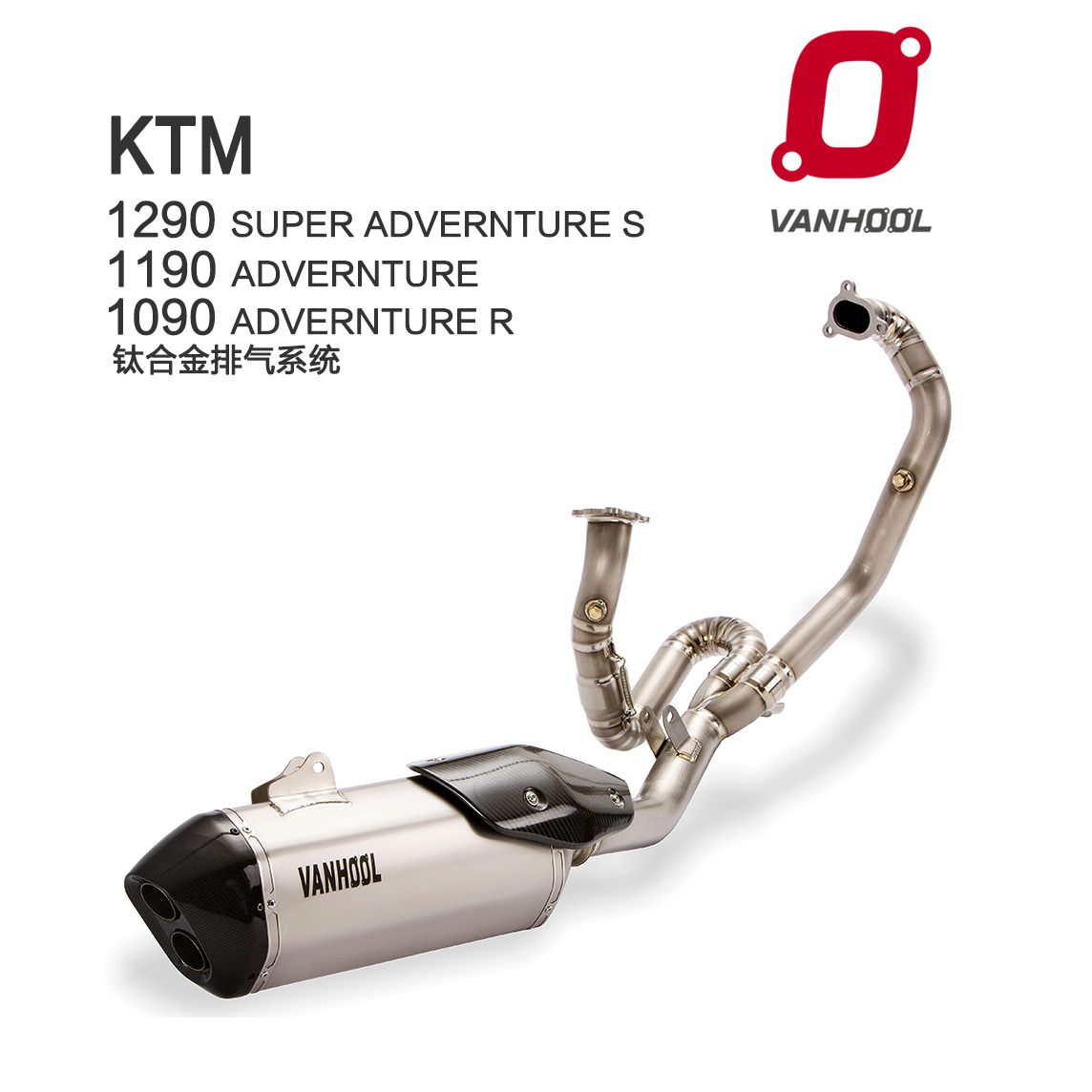 KTM 1090/1190/1290ADV系列,这几款车型排气通用!动力方面相对原厂提升5-8%左右!VANHOOL为1290开发的这款高性能整套排气,整套排气都是按照原厂插口数据设计!完全原装位,无需破损安装!我们用最顶尖的排气材质进口钛合金,超轻量化,是原厂排气的三分之一重,声音更加动感带有张力!排气配备了消音塞!可以根据车友的驾驶习惯,拆装消音塞体验不一样的驾驶感受!